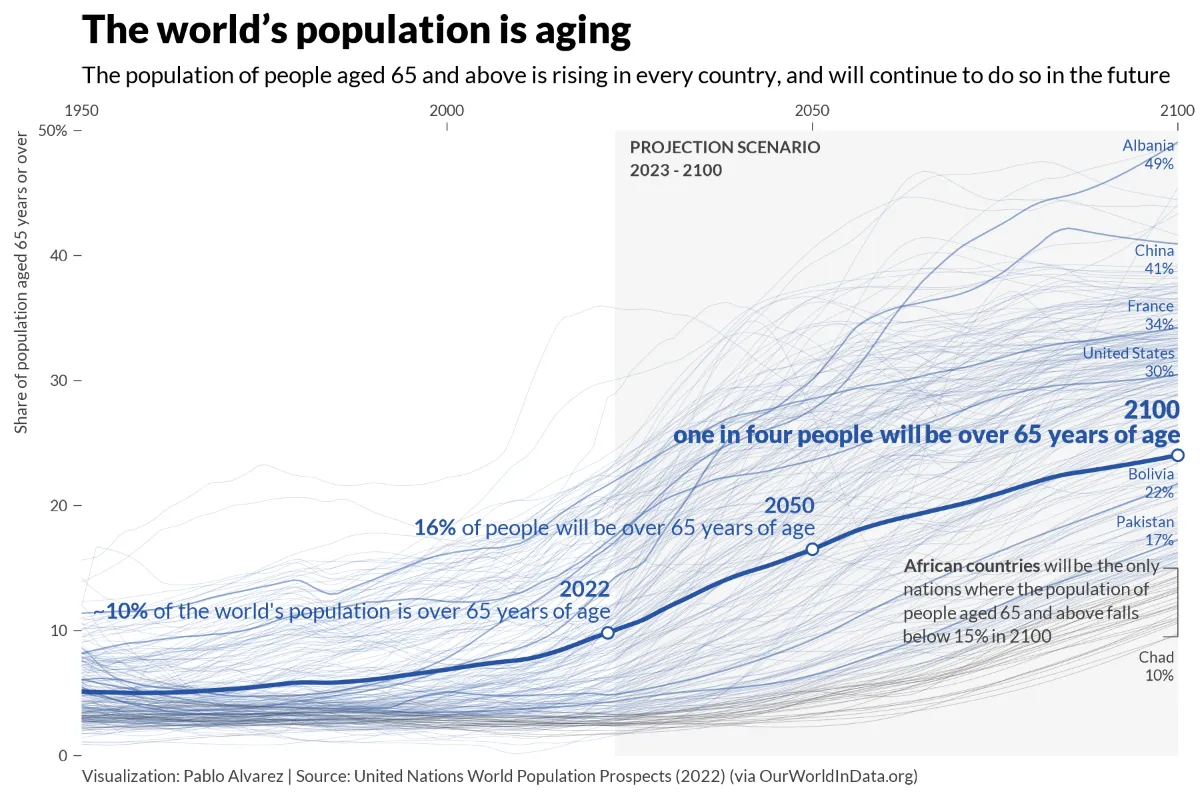 Over 10% of the world’s population are currently over 65 years of age, and by the end of the century that percentage is expected to rise to 25%.