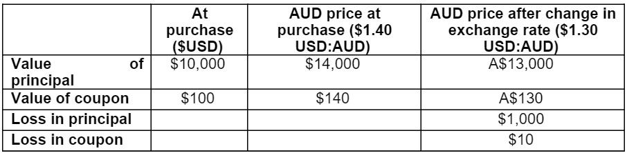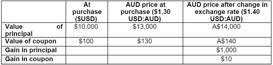 You purchase a bond for US$10,000 and it pays coupons of US$100. If the US dollar strengthens against the Australian dollar, then the value of your investment converted back into Australian dollars is now worth more. You are effectively receiving a higher yield, and the return of your principal at the maturity date is higher than your initial investment converted back into Australian dollars.