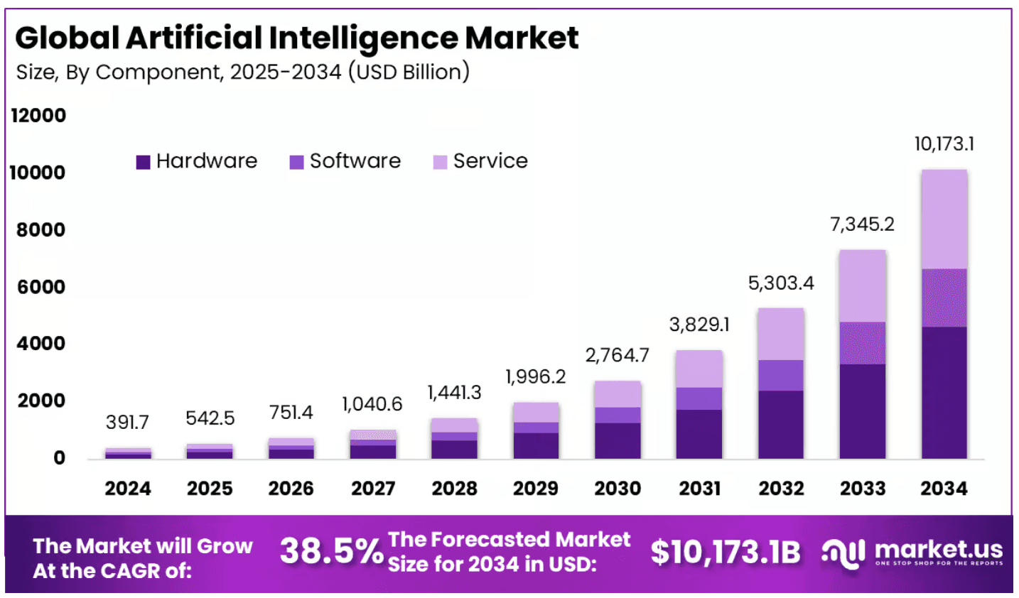 As shown below, the AI market is expected to grow at 38.5% p.a. for the coming decade. That won’t surprise many investors. Many have exposure through the Mag 7, or the vast array of US or Asian-based emerging companies in this innovative space.