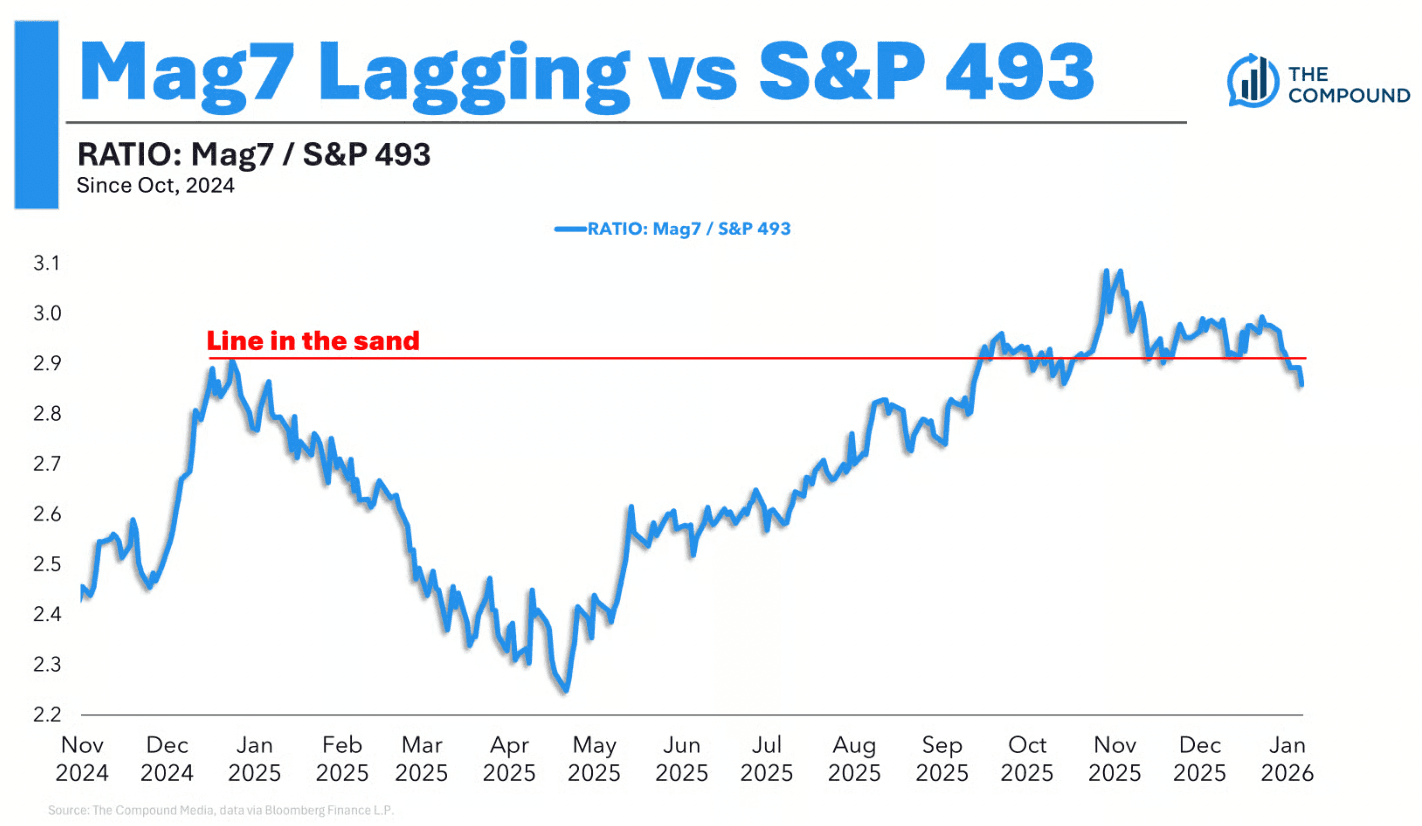 If you examine the ratio of the Magnificent Seven to the remaining 493 stocks in the S&P 500 you’ll notice something striking. That ratio has declined sharply in recent weeks, meaning big tech is no longer outperforming the rest of the market. Your eyesight isn’t letting you down, the Mag7 have indeed started 2026 as underperformers.