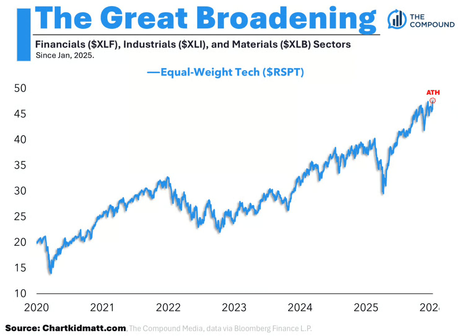 Tech itself recently closed at new highs on an equal-weighted basis, underscoring that this is not one narrow theme carrying markets but a true broadening of participation.