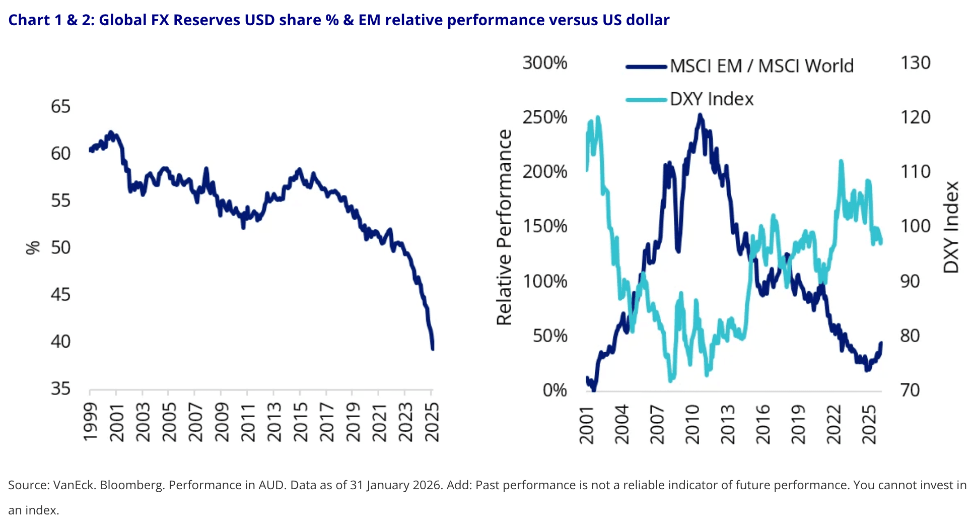 For Australian investors, this backdrop introduces a powerful second-order effect. EM returns are no longer solely a function of equity performance, but also of currency translation. During periods when the US dollar softens, EM exposure can deliver a dual uplift.