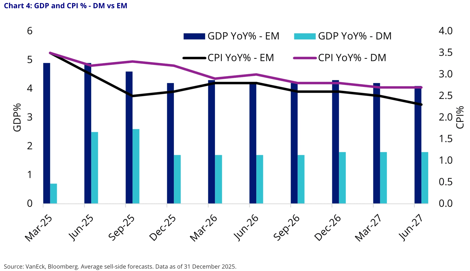 EMs entered 2026 with a sense of renewed purpose. Economic growth was well in excess of developed markets, capital was flowing in, and the global rate-cutting cycle that began in 2024 had reoriented investor attention away from the developed world.