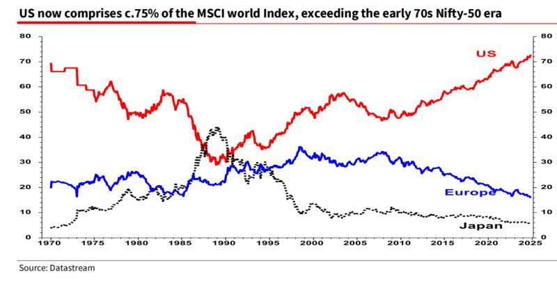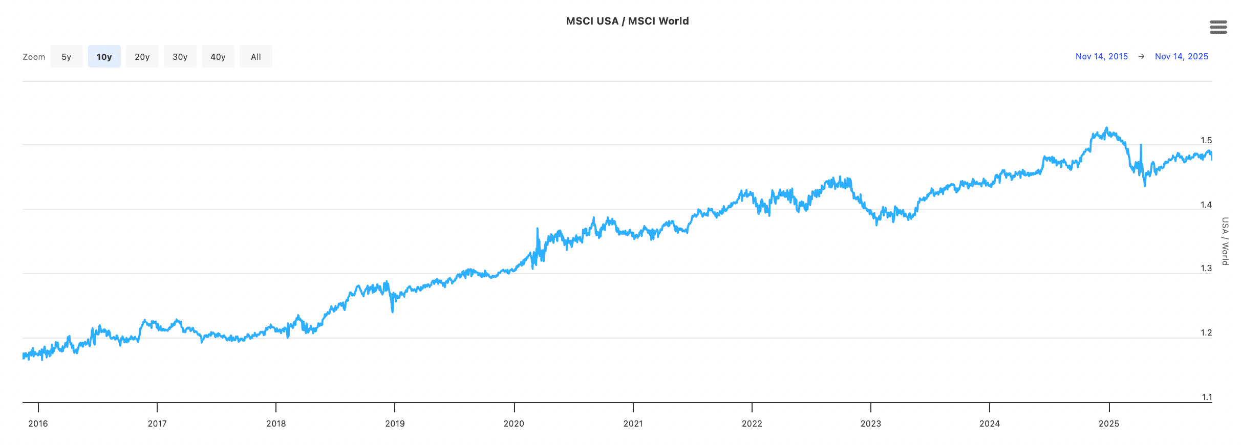 Wed 3 Dec 2025 6 minutesFor more than a decade, it’s rarely been wrong to be long U.S. equities. The numbers are hard to argue with: the MSCI USA index has outperformed the MSCI World index by almost 50% over the past ten years. The longer term data is even more stark: U.S. stocks have risen from 30% of the MSCI World Index in the 1990s to 75% today. For all intents and purposes, U.S. stocks now dominate global equities.