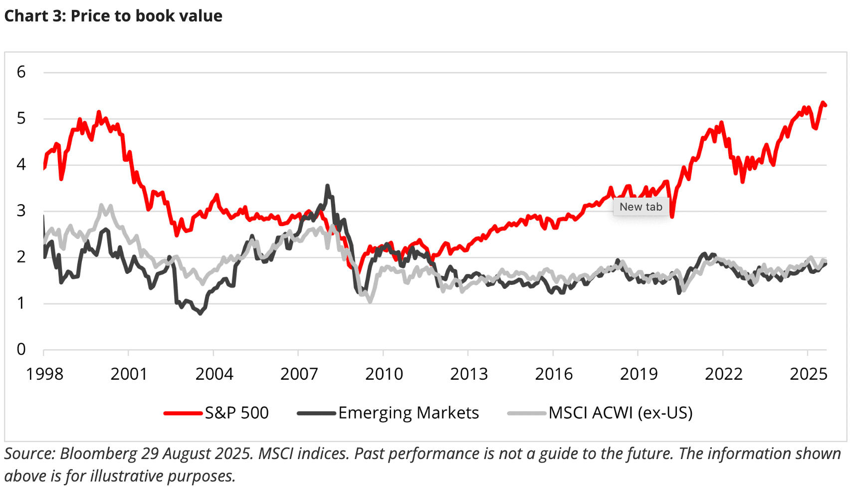 The difference is even starker on a price/book value basis, with the S&P 500 trading at more than double the multiple of the MSCI ACWI ex USA index.