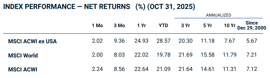 The consensual view that the U.S. is positioned for continued global outperformance has been tested in 2025. For the first time in a long time, international markets have outperformed the U.S. As shown below, the MSCI ACWI ex USA index is 9% ahead of the MSCI World Index year to date.
