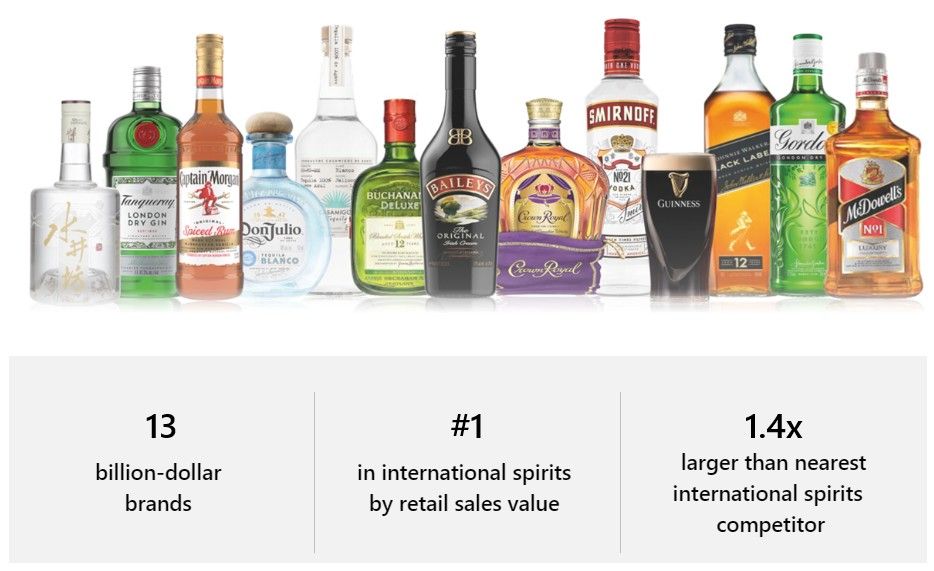 Diageo holds the number one position globally in whisk(e)y, tequila, vodka, gin, liqueurs and non-alcoholic spirits. In terms of retail sales value, its market share is more than 1.4x that of its nearest international competitor. It is the dominant force in a large global industry.