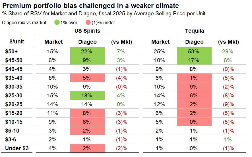 The company’s interim results for 2026 laid these headwinds bare: North American organic sales fell 6.8%, with US tequila sales down 23% as competition intensified in a softening category. As the price-tier chart below illustrates, Diageo's US portfolio is heavily skewed towards the premium end—53% of its tequila sales sit at $50+ per unit versus just 25% for the market. In a strong consumer environment that skew is a margin advantage. In the current climate, however, it means there is little in the portfolio to capture trade-down demand, amplifying the impact on earnings. Management has acknowledged this, signalling a pivot towards broader price-packs and smaller formats—an attempt to bridge these gaps without compromising the company’s core premium brand exposure.