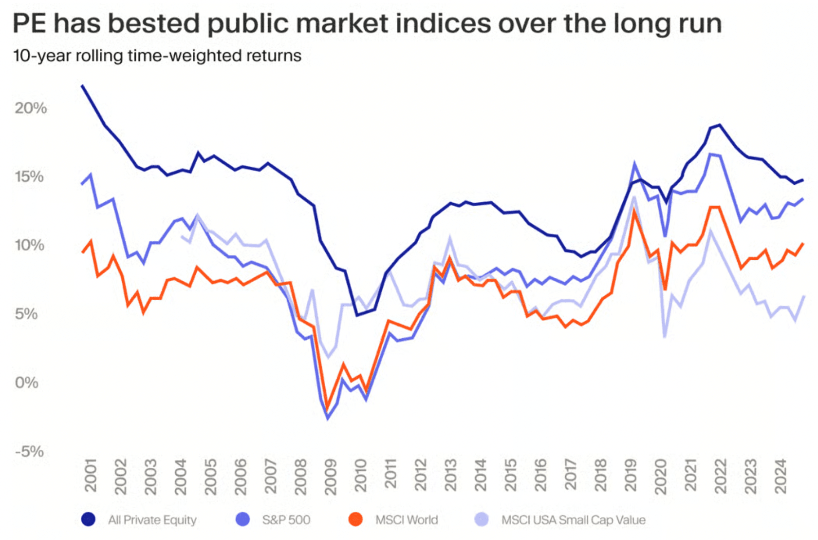 The logic of investing in the private markets is pretty straightforward. Private equity has historically outperformed the public markets over the long term, especially during periods when listed returns have been subdued.