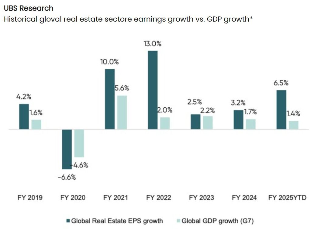 Meanwhile, operational fundamentals are strengthening. While global GDP growth is forecast to remain sluggish—hovering around 1.4% to 1.7%—global real estate earnings per share growth (EPS) is forecast to accelerate sharply, hitting 6.5% in 2025.
