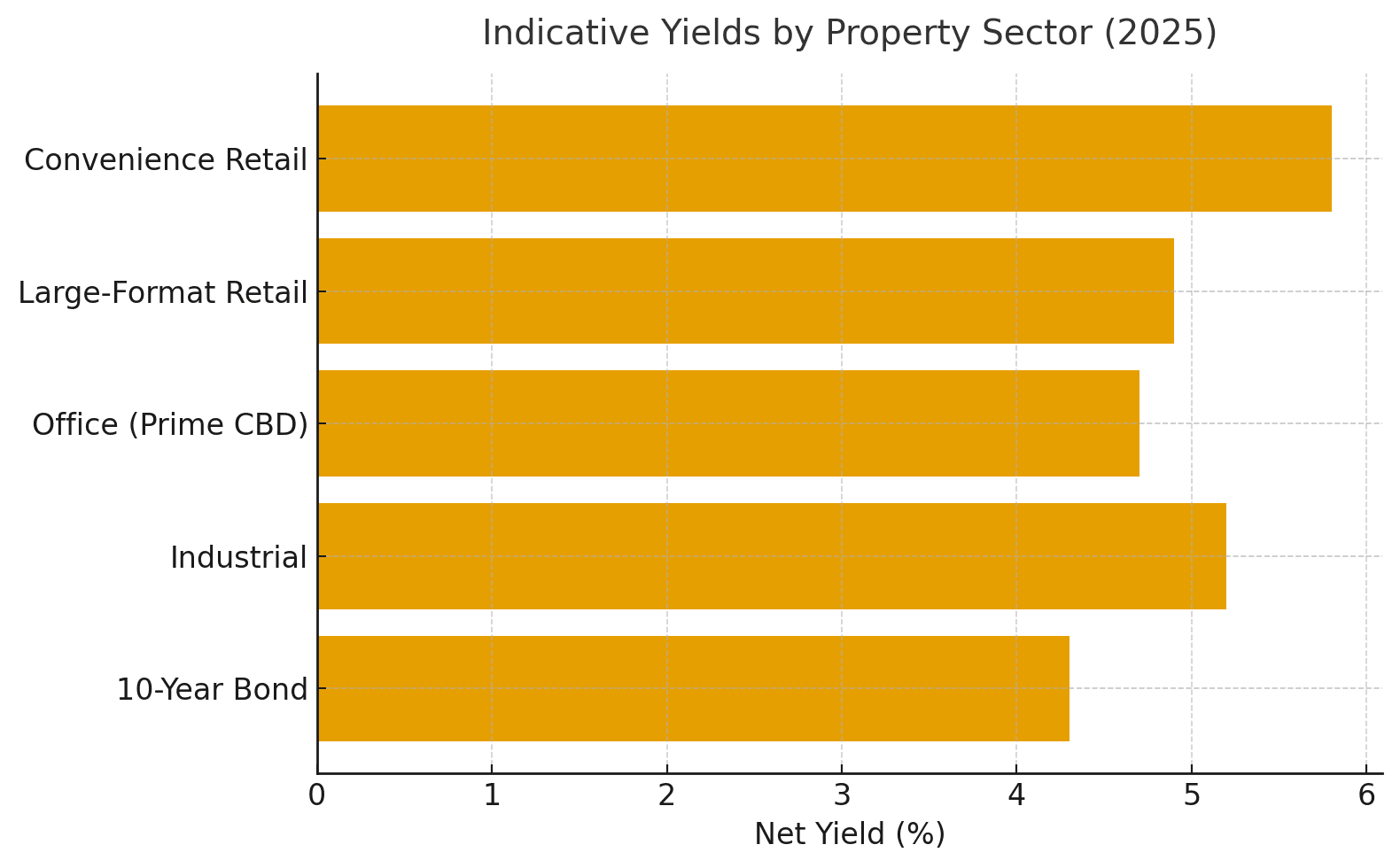 Yields in neighbourhood and sub-regional centres have been compressing in 2025 as the market has been discounting further RBA policy easing.