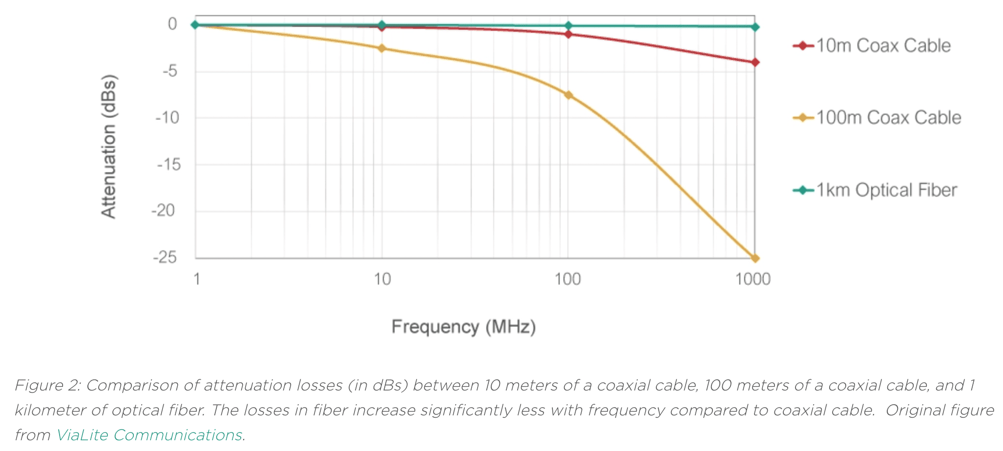When electrical signals travel through wires or coaxial cables, resistance causes some of the energy to be lost as heat. Light travelling through optical fibre faces far less resistance, so much less energy is lost when data is transmitted. As the chart below shows, energy loss rises rapidly as signals become faster and carry more data.
