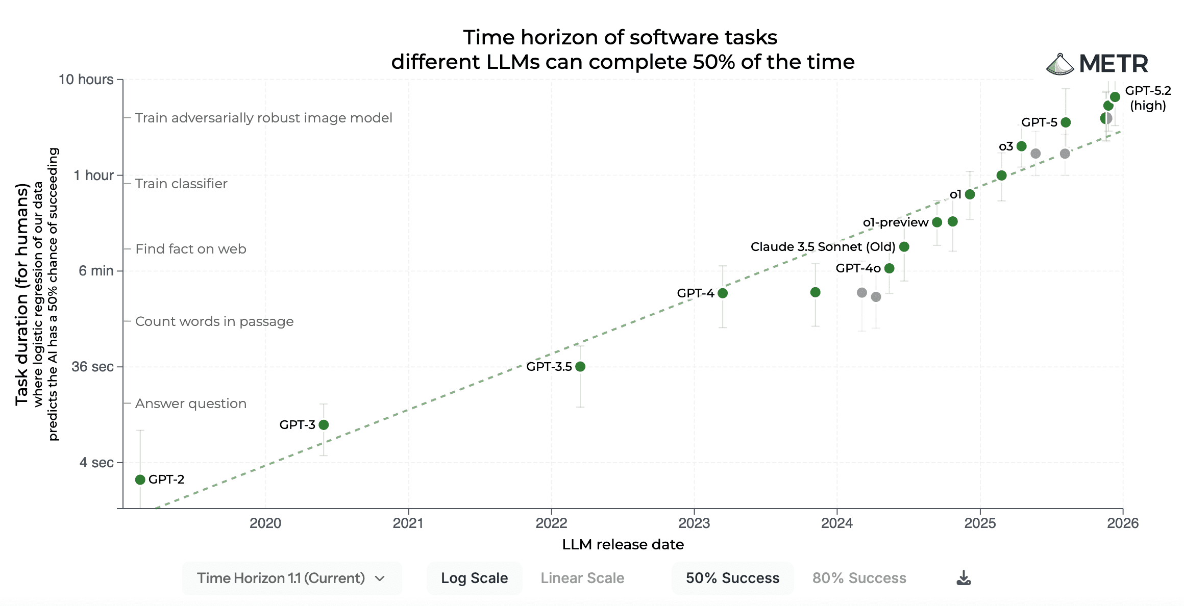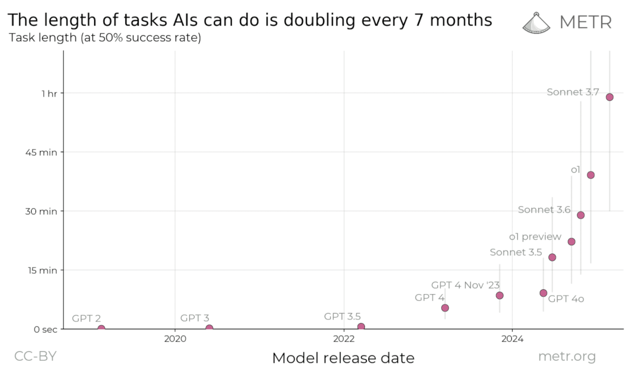 In March 2025, METR reported that AI ‘time horizons’, the length of tasks a model can complete end-to-end without human intervention, was increasing exponentially, with a doubling time of roughly seven months. More recent data has confirmed this evolution.