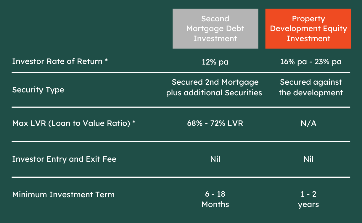Each investment opportunity varies in size, location, LVR, loan term, return and risk, and is always located within key regions or major cities across Australia.
