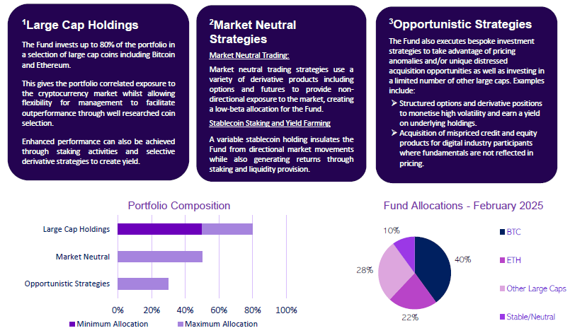 Between 20% and 60% of the Fund will be allocated to market neutral and fixed income strategies which give non-directional exposure to products mitigating against typical digital asset volatility.