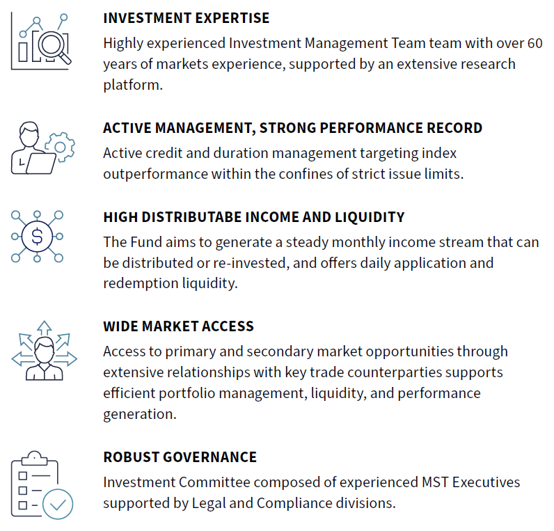 The Fund aims to achieve a steady stream of income by focusing on shorter-term, investment-grade bonds with limited sector switching. While prioritizing reliable income, the Fund may incorporate a strategic allocation to higher-yielding bonds for potentially increased returns. Careful management of bond maturities and optimising credit quality with yield generation is the central task of the Investment Manager.