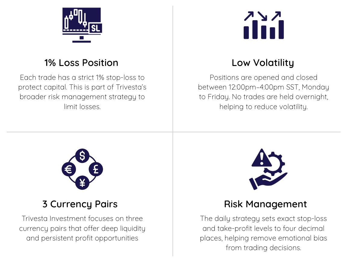 The Fund allocates 100% of its committed capital to secured notes issued by Trivesta Investment. Trivesta Investment then utilises the proceeds to engage in foreign exchange trading activities, aiming to generate high returns to meet its obligations under the issued notes, including interest payments and principal redemption. This strategy seeks to enhance returns while controlling downside risks through position management, a focus on high-liquidity currency pairs, and a combination of technical and fundamental analysis.